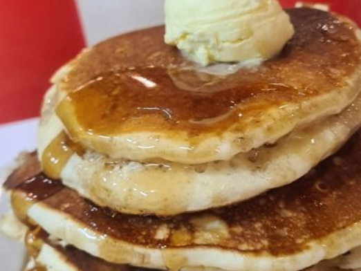 A stack of light, fluffy pancakes with whipped butter and maple syrup, or eggs how you want them with American style bacon, sausage patty, or both. Crispy hash browns and coffee!